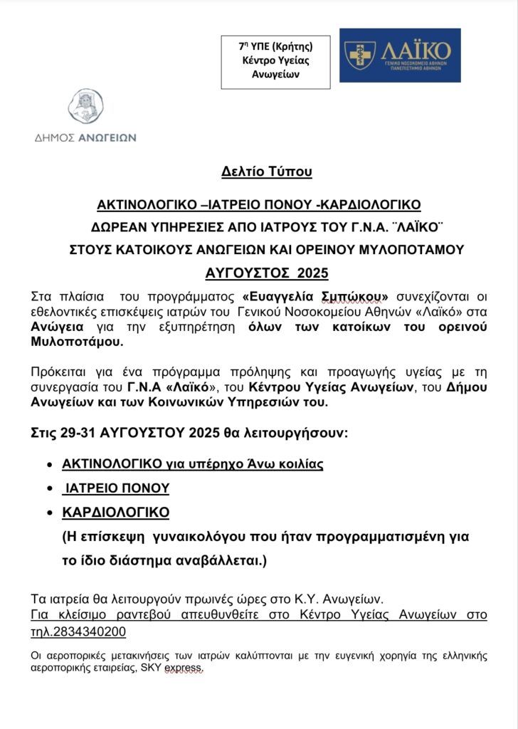 20/08/2025 Μετάβαση στα συνημμένα αρχεία FacebookTwitterWhatsAppPinterest EmailLinkedIn Δωρεάν υπηρεσίες απο ιατρούς του Γ.Ν.Α. “ΛΑΪΚΟ” στους κατοίκους Ανωγείων και Ορεινού Μυλοπόταμου 29-31 Αυγούστου