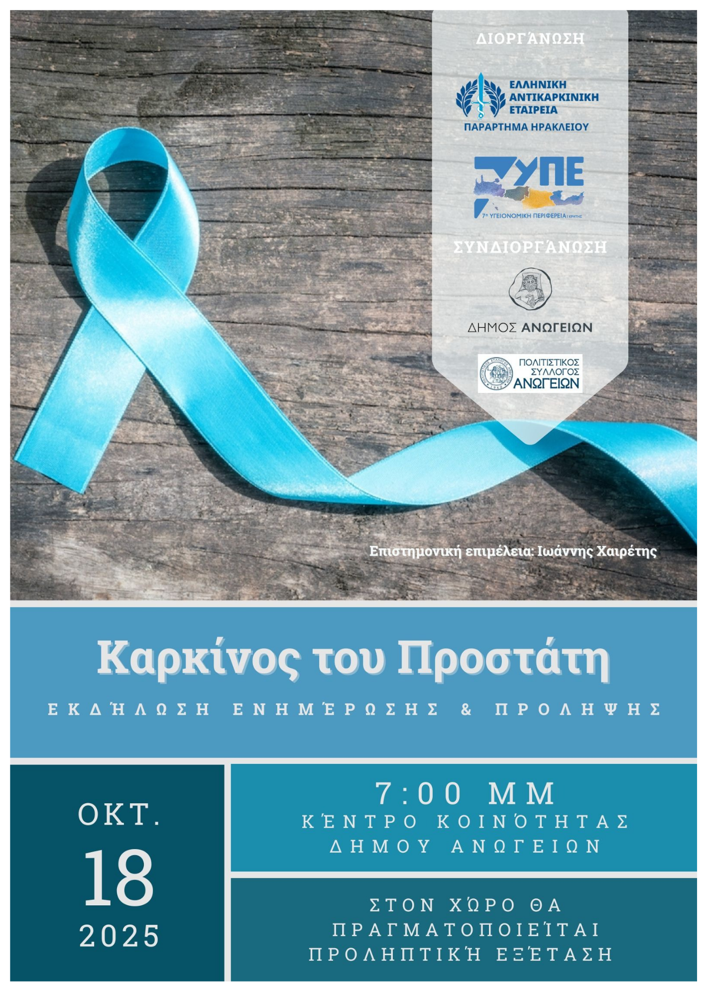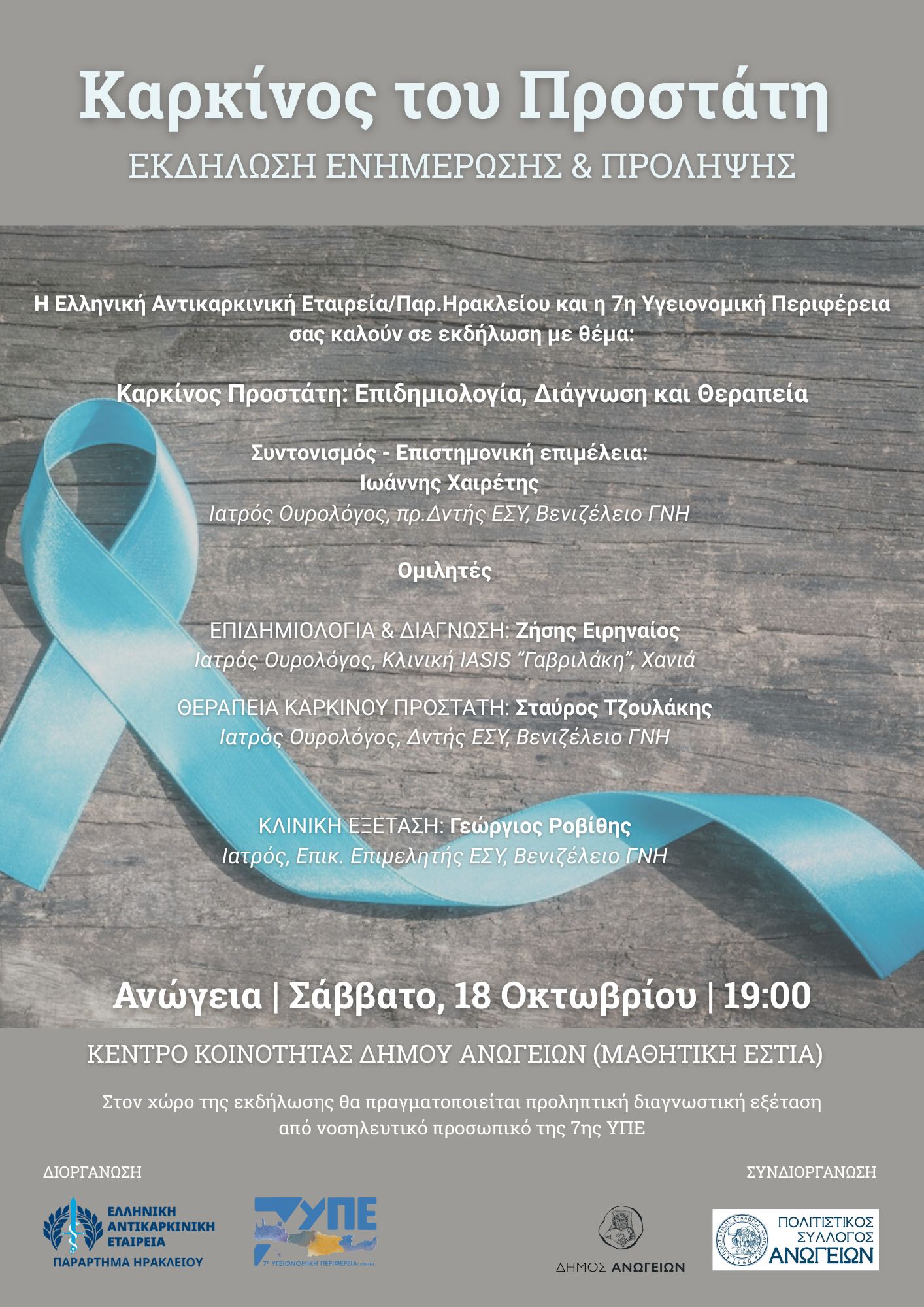 Στο πλαίσιο ευαισθητοποίησης για την ανδρική υγεία και της ενημέρωσης για την πρόληψη του καρκίνου του προστάτη, η Ελληνική Αντικαρκινική Εταιρεία/Παράρτημα Ηρακλείου και η 7η Υγειονομική Περιφέρειας Κρήτης σε συνεργασία με τον Δήμο και το Κέντρο Κοινότητας Δήμου Ανωγείων, διοργανώνουν Εσπερίδα Ενημέρωσης & Πρόληψης ανοιχτή στο κοινό, με θέμα: