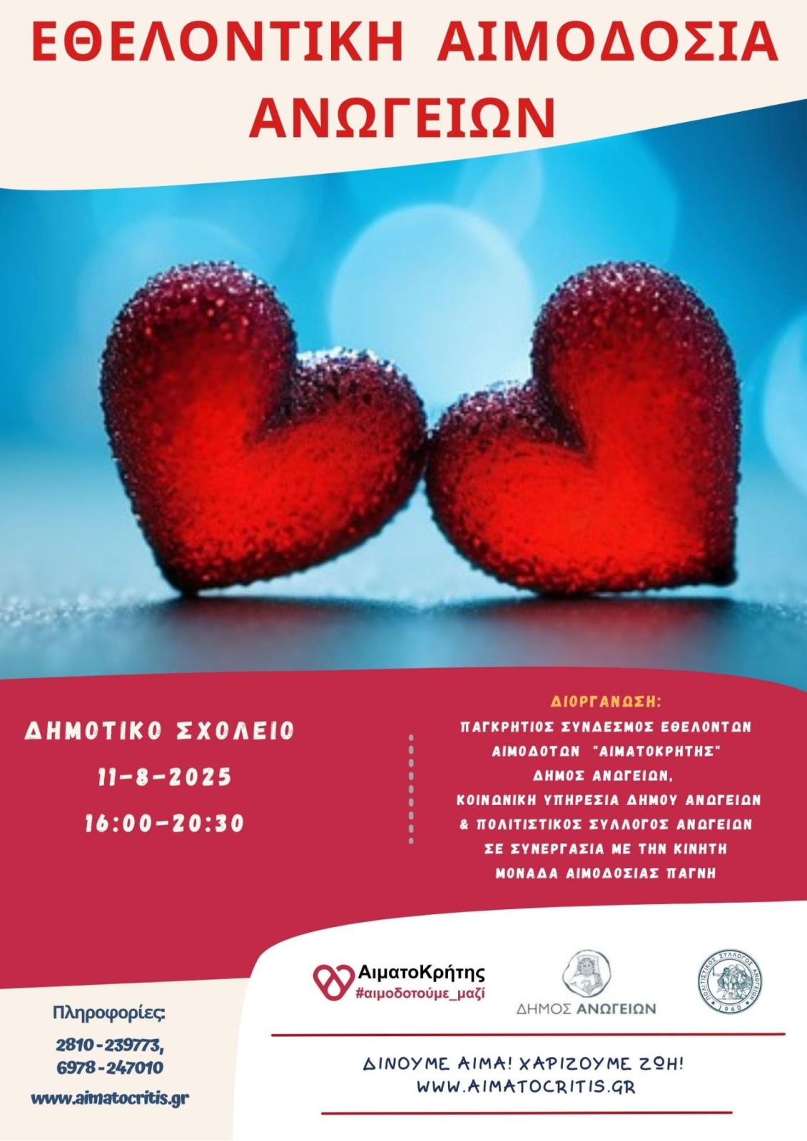 Εθελοντική Αιμοδοσία Ανωγείων στο Δημοτικό Σχολείο Ανωγείων 11/8/2025 ώρα 16:00 με 20:30