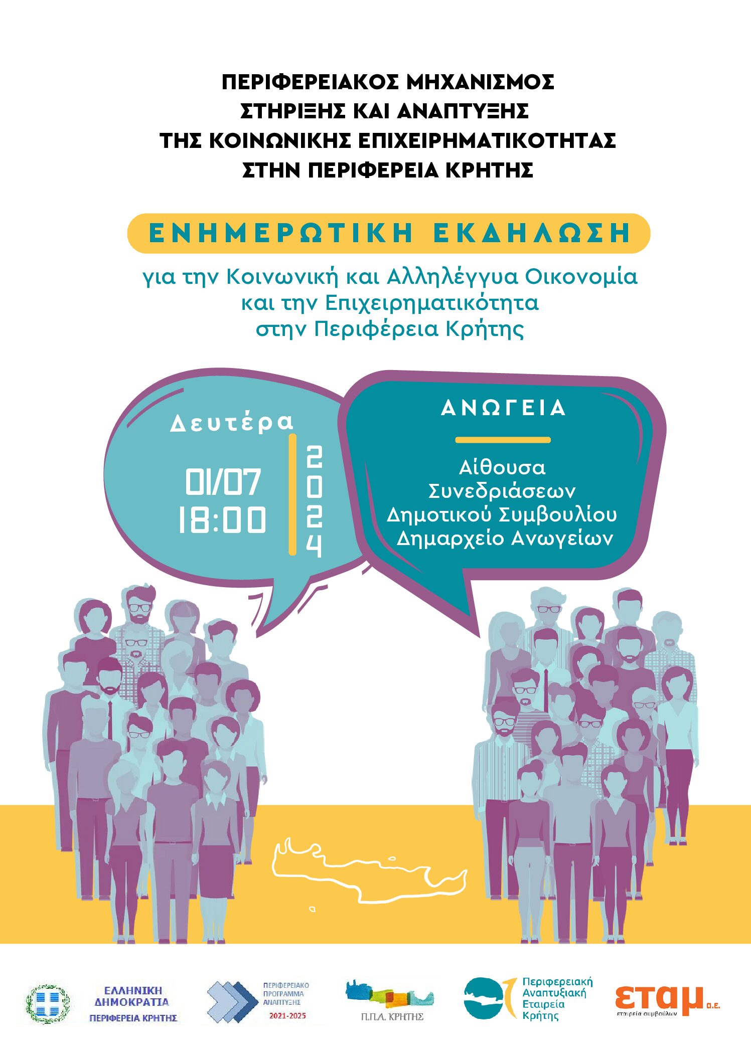 Η Περιφέρεια Κρήτης και η Περιφερειακή Αναπτυξιακή Εταιρεία Κρήτης ΑΕ σας προσκαλούν να συμμετέχετε στην ενημερωτική εκδήλωση για τη Λειτουργία του Περιφερειακού Μηχανισμού Στήριξης και Ανάπτυξης της Κοινωνικής Επιχειρηματικότητας στην Περιφέρεια Κρήτης που πραγματοποιείται στην Αίθουσα Συνεδριάσεων του Δημοτικού Συμβουλίου στο Δημαρχείο Ανωγείων την Τετάρτη 03 Ιουλίου 2024 και ώρα 18.00μμ.