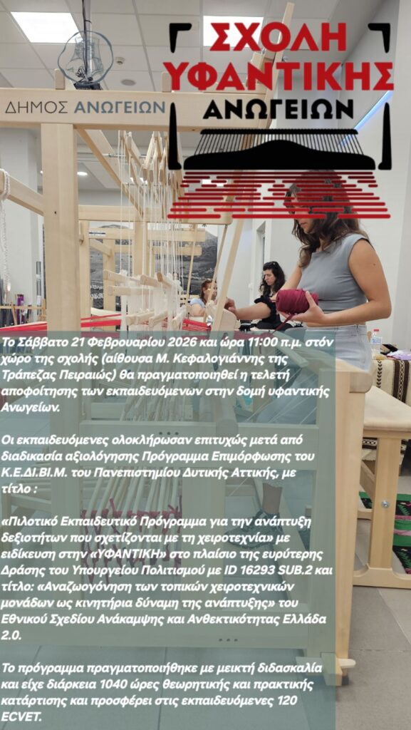 21/2/2026 έως 21/2/2026 στις 11:00 FacebookTwitterWhatsAppPinterest EmailLinkedIn Τελετή αποφοίτησης των εκπαιδευόμενων στη δομή υφαντικής Ανωγείων