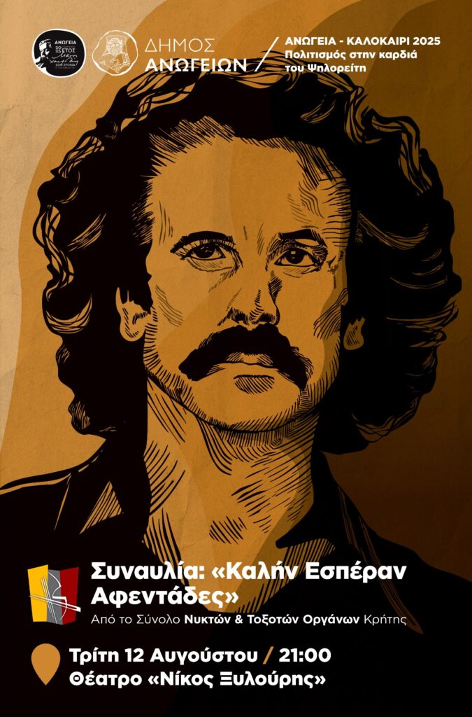 12/8/2025 έως 12/8/2025 στις 21:00 FacebookTwitterWhatsAppPinterest EmailLinkedIn Συναυλία: “Καλήν Εσπέραν Αφεντάδες” από το Σύνολο Νυκτών & Τοξοτών Οργάνων Κρήτης Τρίτη 12 Αυγούστου ώρα 21:00