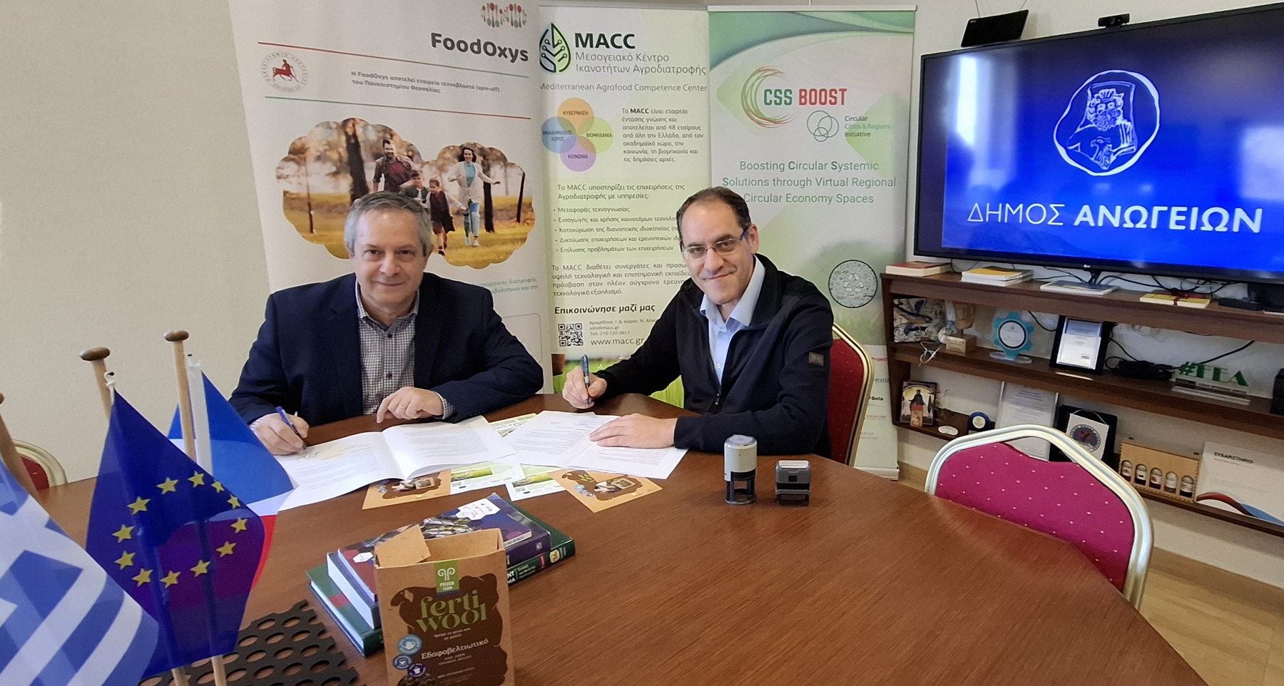 Υπεγράφη σήμερα, 10 Απριλίου 2025, Μνημόνιο Συνεργασίας μεταξύ του Δήμου Ανωγείων και του Μεσογειακού Κέντρου Ικανοτήτων Αγροδιατροφής (Mediterranean Agrifood Competence Center – MACC). Το μνημόνιο υπέγραψαν ο Δήμαρχος Ανωγείων, κ. Σωκράτης Κεφαλογιάννης, και ο Διευθύνων Σύμβουλος του MACC, Δρ. Μιχάλης Καθαράκης, στις εγκαταστάσεις του MACC.